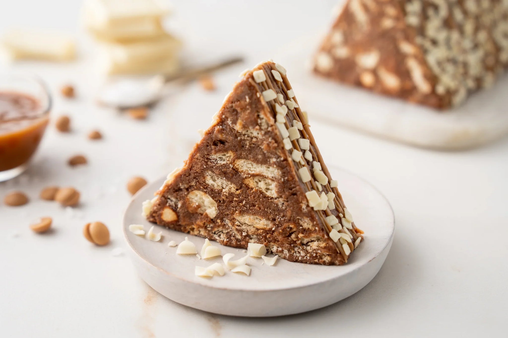 Love the rich sweetness of caramel? The Salted Caramel Mosaic Cake layers crisp butter cookies with our signature chocolate sauce and ribbons of salted caramel for the perfect balance of sweet and savory. Each bite is decadent and irresistible, with golden caramel against dark chocolate creating a delicious contrast.